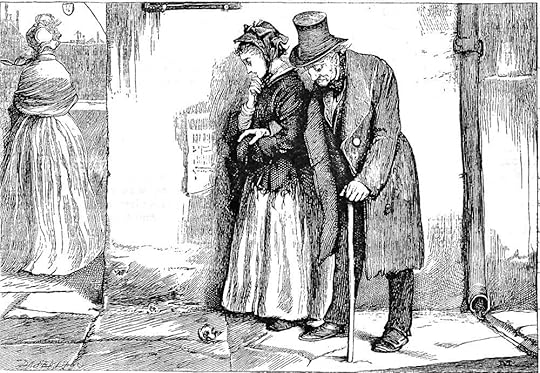 The other imbedded clue as to the date of the scene is the presence of a London "Peeler" or "Bobby" in the background, just behind Little Dorrit. Sir Robert Peel's founding of the metropolitan police force in September 1829 is consistent (or nearly so) with Dickens's dating of the novel's action. Of the other artistic interpretations of Old Nandy, surely those of Phiz and Sol Eytinge, Junior, offer a more accurate assessment of the cheerful senior than Furniss's portrait of a sour curmudgeon.