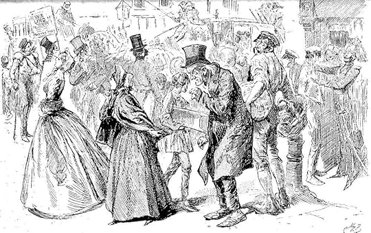 Furniss captures the hypocrisy of the younger Dorrit sister, whose character is reflected in the indignant glance of a tradesman immediately behind Old Nandy (centre). Furniss reinterprets in a highly animated fashion not one of the original Phiz serial steel-engravings, but James Mahoney's Household Edition composite woodblock engraving They were within five minutes of their destination. Furniss's focusing on the contrasting behaviors of the siblings effectively exemplifies the irony of the chapter title.