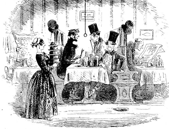 “where the waitress, a bouncing young female of forty, is supposed to have made some impression on the susceptible Smallweed … Mr. Smallweed leads the way. They know him there and defer to him.” He knows which dishes to order, and which to avoid. Thus, with Bartholmew Smallweed there to guide them, Mr. Guppy and Mr. Jobling indulge in “veal and ham and French beans—and don’t you forget the stuffing, Polly” and “pint pots of hand-and-half”, which are mixtures of light and dark ales.