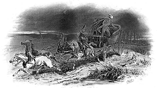 "The sun had gone down full four hours, and it was later than most travellers would like it to be for finding themselves outside the walls of Rome, when Mr Dorrit's carriage, still on its last wearisome stage, rattled over the solitary Campagna. The savage herdsmen and the fierce-looking peasants who had chequered the way while the light lasted, had all gone down with the sun, and left the wilderness blank. At some turns of the road, a pale flare on the horizon, like an exhalation from the ruin-sown land, showed that the city was yet far off; but this poor relief was rare and short-lived. The carriage dipped down again into a hollow of the black dry sea, and for a long time there was nothing visible save its petrified swell and the gloomy sky."