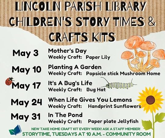 Lincoln Parish Library Children's Story times and Crafts Kits May 3, Mother's day, craft is Paper Lily May 10, Planting a Garden, craft is Popsicle stick Mushroom Home May 17, It's a Bug's Life, craft is Bug Hat May 24, When Life Gives you Lemons, craft is Handprint Sunflowers May 31, In the Pond, craft is Plate Jellyfish