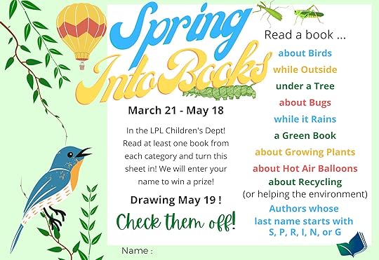 Spring Into Books March 21- May 18. Read at least one book from each category and turn in the sheet to the children's department, your name will be entered into a drawing that will be announced on our Facebook page on May 19, 2022.
