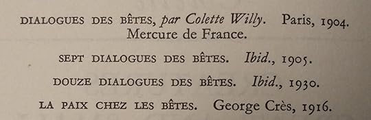 That would be great, Aubrey! What's in Creatures Great and Small? The title is not in her bibliography, but I found several "bestiaries" among her works: "Sept dialogues de bêtes" (1905), "Prrou, Poucette et quelques autres" (1913) and "La Paix chez Les bêtes" (1916)—all early works.