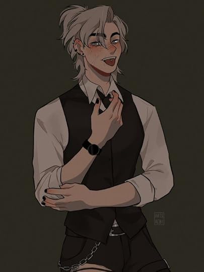 he stands at around 6'3", being a bit taller than his older brother. he weighs a bit more than him as well, being around 840 pounds nearly. he's also a lot more athletic and studious than his brother. his hair is silver, unlike his brother's black hair. much like his brother, his eyes are green and black, as a gargoyle. his horns are longer, black, and curly. his human form, or, his 'fleshy form' as he calls it, is very similar, just, white skin instead of grey. he's not very fond of this form though.