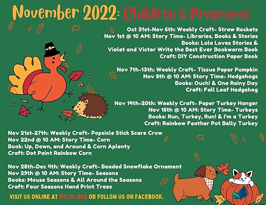 Library Closure will be Wednesday, November 23, 2022 @5pm. We will remained closed on Thursday, November 24 and Friday, November 25, 2022. The Library will open back up at 9am on Saturday, November 26, 2022.