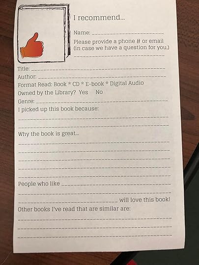 If you liked a book and want to let other people know about it, let us know. Fill out this recommendation sheet and turn it into one of the Information kiosks. You will eventually see your recommendation in the Readers Alert Page!