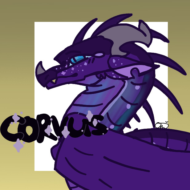Appearance: Corvus is a long and serpentine dragon, with massive drooping wings and a well-fitted body structure. They have high and prominent cheekbones, as well as a strong and pointed jawline. Their front legs are lean and lanky, sporting a set of talons that are razor sharp and shiny. Corvus' scales are a dark inky black, with whorls of deep purple here and there. Their long skinny neck is more blue than purple, with an almost greasy sheen to it. Their snout is long and pointed, freckled with star-like scales. The underside of Corvus' wings are charcoal black, the silver scales scattering out like waves of water. Their eyes are a bright aquamarine, with hints of cobalt and mint. Their pure black horns curl around their head like a ram's, the horn-tip barely brushing their cheekbones.
