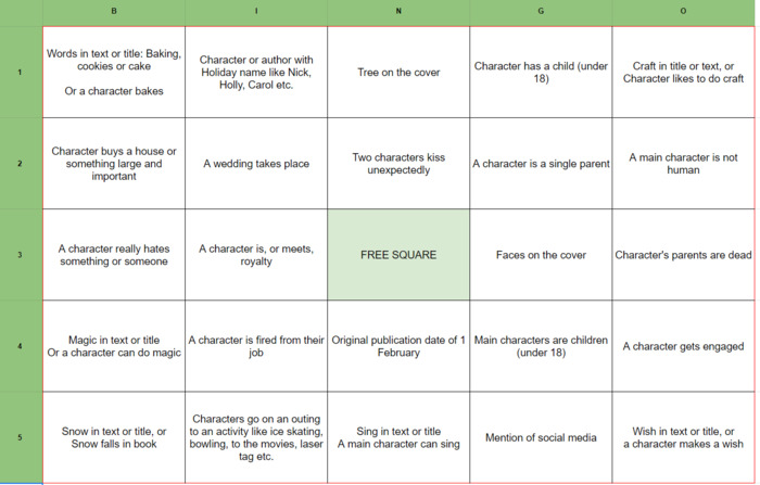 Great! I've added to our tracking sheet in a table under the bingo card on the "bingo" tab. Please update as you read :)