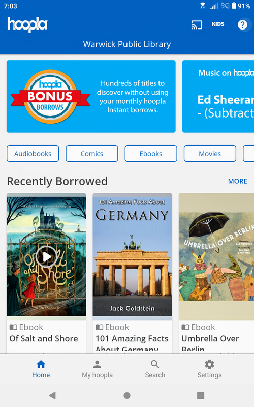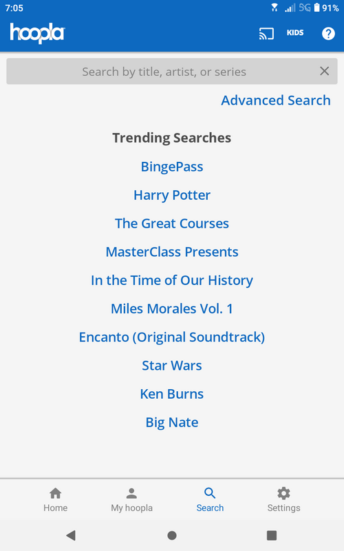 Sign up for Hoopla using your library card number. Set up with your e-mail address and password. Not all libraries have Hoopla but if you belong to a consortium, another library may have access you can use. After logging in: