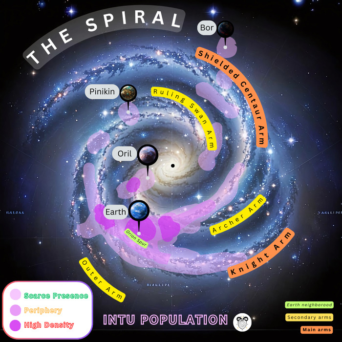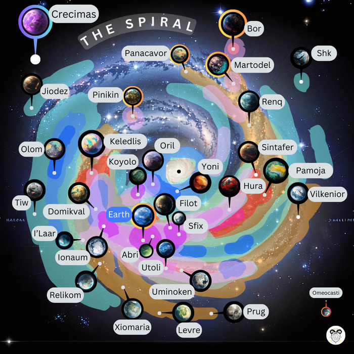 Here are some of my own maps from the galaxy I’m writing about, called The Spiral. They show the main regions, the spread of its civilizations, and all the known (and unknown) worlds scattered across it.