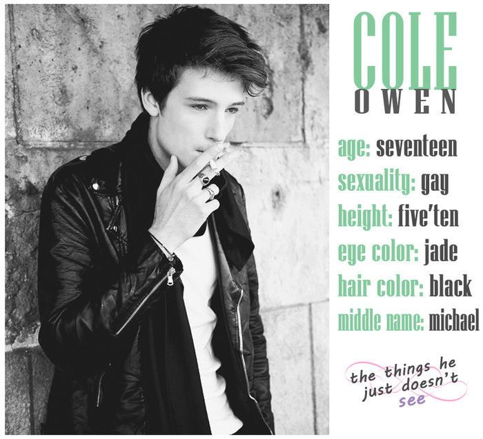 Cole is a seveteen year old that seems to have everything together, but in all honesty he doesn't know a thing about anything. All he really knows is his best friend and his crazy home life. Sure there is work and there is school, but he perfers to think little of both. He's not the greatest student, but he never gets distracted by forces such as having a girlfriend, like most of his other classmates. In fact, Cole has never really dated anyone. He's never had any desire really. It didn't seem worth it, and there was definitly no one out there worth his wild. Well, except for like one person, but ... it was normal to like someone who knew you so well right? Of course he'd have a crush on Jacob. It wans't like it was totally weird, he hoped. Besides, that was like two years ago. He had all but convinced himself by now that the stupid crush was, well, stupid, and hasn't told a soul about his ... non-straight sexuality and perfers to remain partner-less for the time being. Beyond that, Cole lives for music, and plays all kinds of sports. Soccer, basketball, hockey, swimming, he even played volleyball a few times and considered himself to be pretty damn good at it.