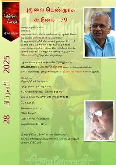 எழுத்தாளர் ஜெயமோகன் அவர்களின் வெண்முரசு நாவல் தொடருக்கான தனிப்பட்ட தொடர் மாதாந்திர கூடுகை புதுவையில் நடைபெற்று வருகிறது. அதன் அறுபத்தி ஏழாவது அமர்வு 26-சனவரி-2024 அன்று வெண்முரசு – 08 – நூல் எட்டு – காண்டீபம் புத்தகத்தின் முதற்பகுதி கனவுத்திரை பற்றி கலந்துரையாடல் நிகழ்கிறது. ஆர்வமுள்ள வாசகர்கள் கலந்து கொள்ளலாம்.