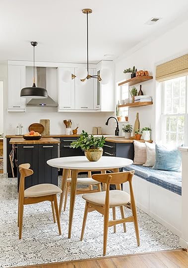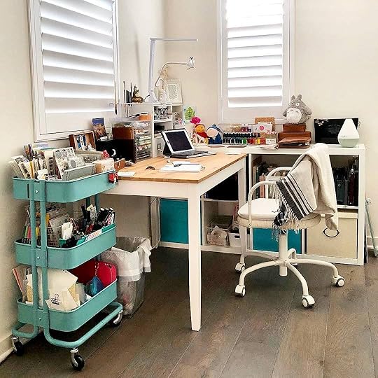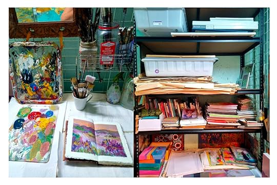 A little house with one bedroom, one bathroom, a kitchen that has an area for dining and a small bench. That area doubles as a living room. There's one additional room that had been intended to be a second bedroom, but they live alone, so they transformed that room into an art room and that's where they let loose. It's messy, and covered in color, which contrasts with the rest of the tidy house.Bedroom: