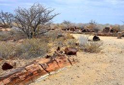 Damaraland is an arid, mountainous region located in north-central Namibia. The main attraction is the Twyfelfontein Valley, designated a UNESCO Heritage Site for the 2000 rock paintings and graffiti that are visible on the local sandstone. They are attributed to the ancestors of the current San and many are believed to be over a thousand years old. The paintings are found in 14 different sites located throughout the valley. Nearby is the petrified forest of Khorixas, the largest accumulation of fossil trunks in southern Africa. The well preserved trunks are found in an ancient river channel where they were presumably dragged there by a flood, and then covered by sediments that caused them to become fossilized.