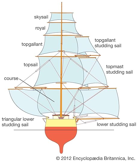The edition of the book I received from the library, which is the same one showing at the top of this discussion, as a drawing of a clipper ship with studded sails :). Here's a diagram of one with 3 studded sails (extra sails on a square rigged ship)