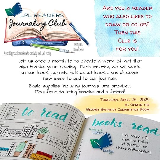 We are starting a new recommendation from our patrons. I, Robin, have a program I started last year. LPL Journaling Club. We meet once a month, work on our journals, chat, enjoy a snack, meet new people and talk about books.