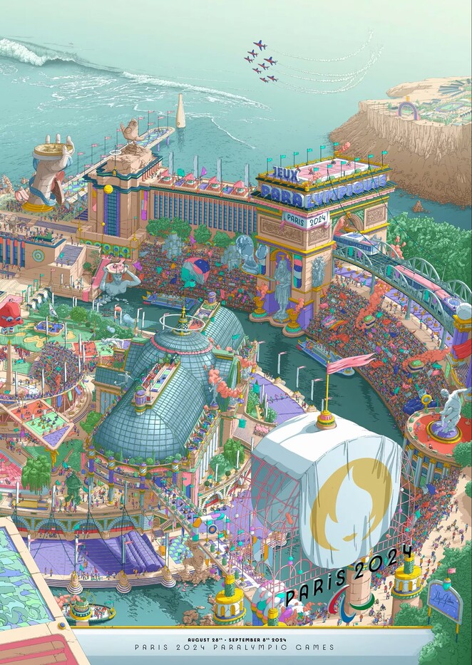 The official poster for the Olympic and Paralympic Games Paris 2024, by illustrator Ugo Gattoni.