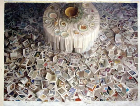 In Vincent Desiderio's ambitious new painting, "Cockaigne," six centuries of Western art lie scattered on the floor like the remains of a really great party. A virtuoso representational painter known for his large-scale, postmodernist allegories, Mr. Desiderio worked on the 13-by-9-foot "Cockaigne" on and off for 10 years. On the pages of the books in the painting, he painstakingly reproduced miniature versions of his favorite works by artists ranging from Masaccio, Vermeer and van Eyck to Matisse, Jasper Johns and Chuck Close.