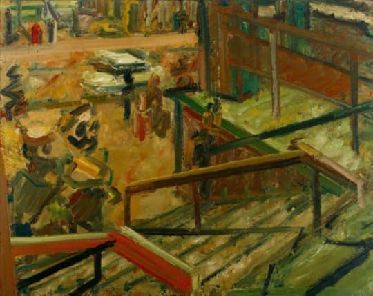 'Euston Steps - Study' is one of a number of paintings made by Frank Auerbach in the train stations, building sites and streets around his studio in London's Camden Town. This is one of a series of paintings depicting the steps at Euston Station. While the word 'study' suggests that this is a preliminary experiment for a larger or more polished work, in fact this is a finished painting. The expressionist, thick impasto brushwork and the palette of browns, greens and oranges are typical of Auerbach's painting of this period. In both his portraits and landscapes, Auerbach has attempted to capture something deeper than what is immediately seen. He once described the difference between 'the sort of painter who is arranging things on a surface for their own sake and the sort of painter who has a permanent sense of the tangible world ... to make a true record, the experience has in some way to be digested and turned into the artist's gesture'.