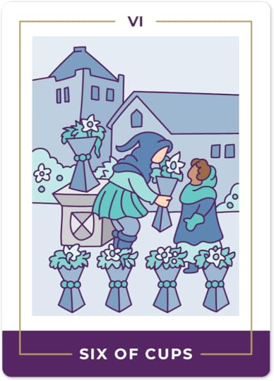 Six of Cups – Nostalgia, memories, childhood "The Six of Cups appearing can indicate that while we may look upon the past with a happy eye, we must avoid living in it. It can also mean that you are be returning to a familiar place. You are seeking to reconnect with people from your past. Bringing back old memories reminds us of our childhood, a time when things were simpler. "