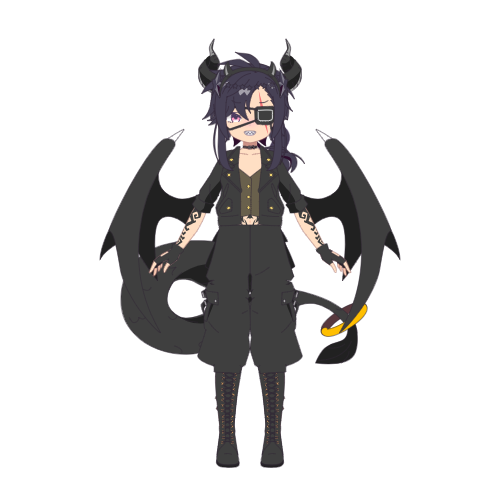 {Appearance} Dragon-human hybrid. Has short purple hair, black horns, dark purple wings and tail. Has purple scales on some parts of his body, one orange eye and one purple eye.