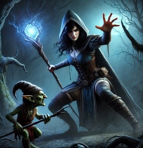 With practiced precision, she channeled her energy, the tip of her staff glowing an intense blue. She swung it forward, striking the goblin over its ugly head.