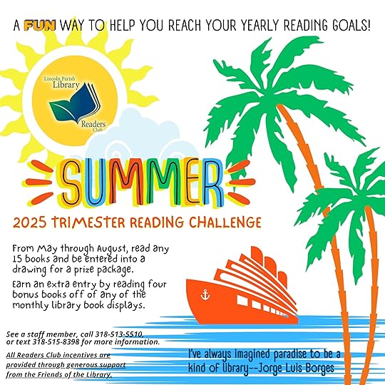 Be a member of the Lincoln Parish Library Readers Club. (If not a member, you can join the club when you begin the challenge.) To earn one entry into the prize drawing, read any 15 books between Thursday, May 1 and Sunday, August 31, 2025. Keep track of your books inside this log. To earn an additional entry into the prize drawing, read any four books that you select from the Library’s monthly book displays. Log those titles below. (This totals 19 books read.) Present your completed challenge log to a staff member at one of the Information Kiosks by 8:00PM on Tuesday, September 2, 2025 (Scans or photos emailed to rhawkins@mylpl.org are also accepted.)