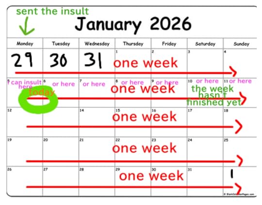 jan 5 to jan 11,. But the week hasn't even ended yet, it's still jan 6. Ill send the insult on jan 7 or 8 or 9 or 10 or 11 and it'd still count — cuz the week hasn't ended yet.