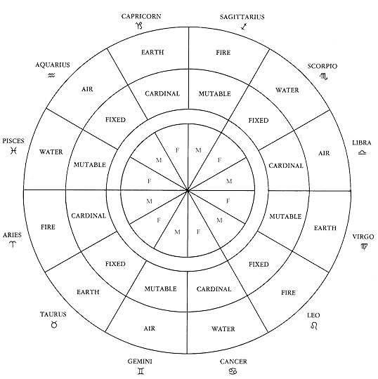 There are twelve signs in the zodiac. Each sign has an associated "element" (features that are common between signs), "modality" (describes their function in the seasonal cycle), and "polarity" (its energetic orientation).