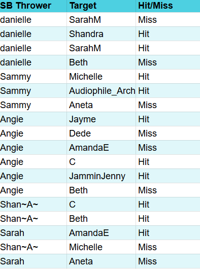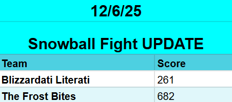 Tomorrow is Saturday, which means Donna and I will be doing our weekly Snowball Fight tally. Before we bundle up and head into the spreadsheets, please take a moment to double-check your logs so no snowballs go missing in the storm!