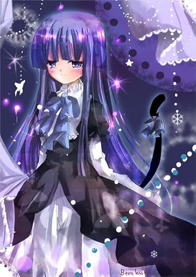 looks:Long black hair,ice-blue eyes,grey shirt-dress with black leggings and striped gray-and-black skull stockings with short clunky black boots