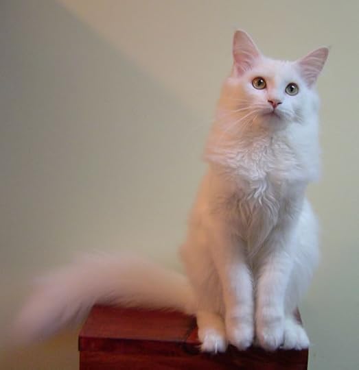 pelt: light gray with darker gray flecks. her feet have long white socks and her chest and tail tip is white.