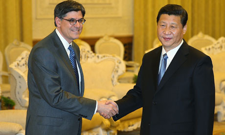 Chinese president Xi Jinping, right, greets the US treasury secretary, Jacob Lew, during a visit to the Great Hall of the People in Beijing. Photograph: Feng Li/Getty