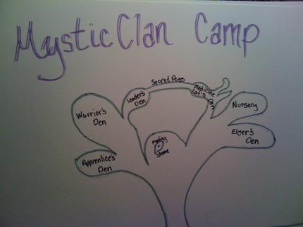 StarlitClan - All can be seen from HighPoint in StarlitClan. The camp is nestled at top of the waterfall in a large bramble thicket that grows there. They can seek the members of MysticClan living below, but not into their camp. The river leading to the waterfall provides a border on one side, as it is much to dangerous to cross or fish in. Their land is a vast open moor land.