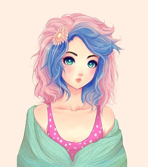 Hair- Her hair, like her eyes, is a mix of two colors, Bright hypnotic pink and a deeper sky blue. Her hair is of medium length, falling just past her shoulders, usually with some form of flower clip in it and worn in a neat messy style.
