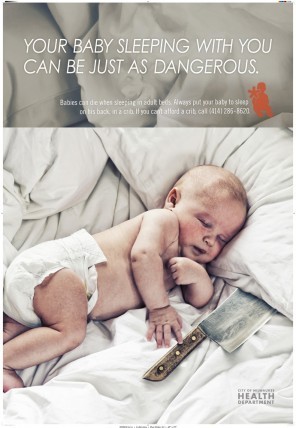 That's exactly what I was going to suggest, LG. Those baby campaigns are nearly always for the fuck ups of our population. We have to keep the children safe from their irresponsible parents in a lot of cases. But it really contributes to the frantic worry of smart, responsible parents...because there's all this media assault about back to sleep and choking and SIDS ect. ect. It makes you feel like these things WILL happen unless you're hyper-vigilant and it's just not true. (IMO)On the rare occasions that I slept in the bed with my babies I knew they were there the whole time. I slept lighter because I knew they were there and I didn't want to roll over on them. That's why I didn't do co-sleeping. I actually wanted to sleep! I still do!