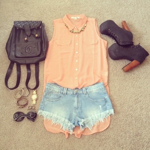 Lilly's heels made a clacking sound as she made her way towards the fro-yo place. Her long blonde hair moved against her backpack and her body seemed to bounce with every step. Peach always brought out her tan, and she was rocking a peach button down and high waisted shorts today. Her black sunglasses with the curly pattern on the side sat on top of her head.