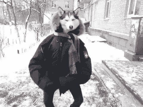 I think it's a person with their husky in their coat in front of them so that you can't see the persons face