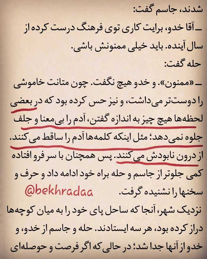 “در بعضی لحظه ها هیچ چیز به اندازه گفتن٬ آدم را بی معنا و جلف جلوه نمیدهد. مثل اینکه کلمه ها آدم را ساقط میکنند. از درون نابودش میکنند”
