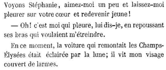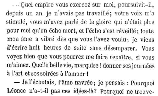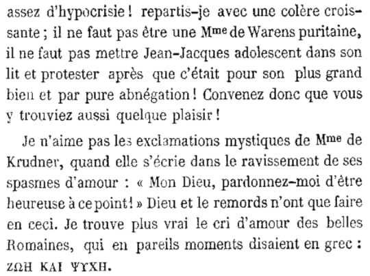 vous qui écrivez, gardez-vous du pathos en amour et ne dissertez pas de ce sentiment naturel et simple, de cet attrait puissant et bien caractérisé qui attire et confond les êtres, avec le langage de la métaphysique et du mysticisme.