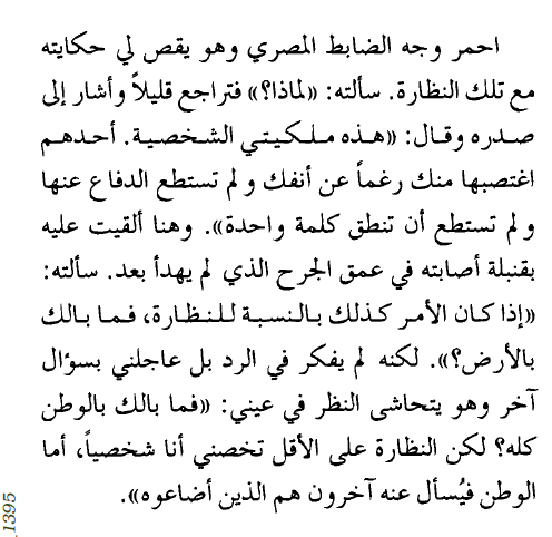 شاهدة الوثائقي قبل سنوات ولازال كلام الجندي المصري يرن في أذني ، الذي بكى من أجل نظارة سلبت منه ، لكنه شعر أنها ملكه ، ولم يبكي من أجل وطن شعر أنه لم يقدم له شئ ......