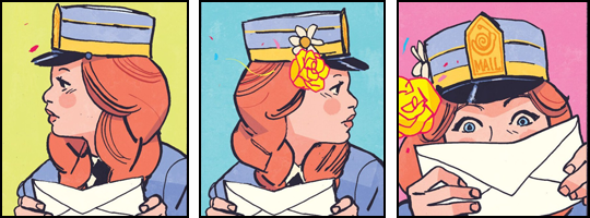 (2) The story here is about a girl mail carrier chasing a wind-blown letter through city streets.