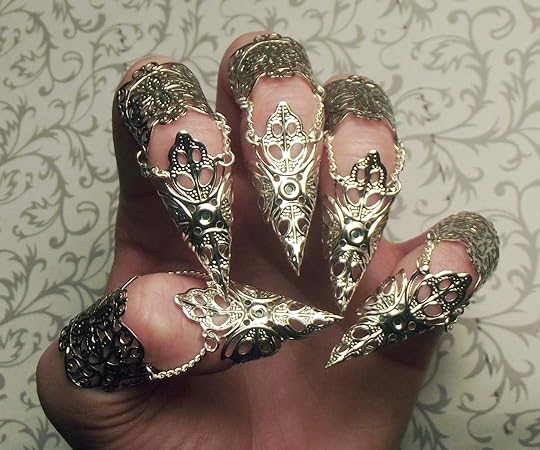 I picture her spred-eagled on my bed, her metallic fingertips shining in the dim light. Sharpness down my back as I'm buried in her hot, soft cunt.