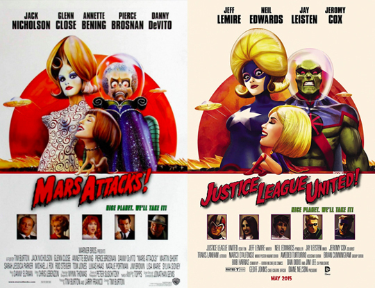 Move poster homage: Mars Attacks (left), Justice League United #10 (right)