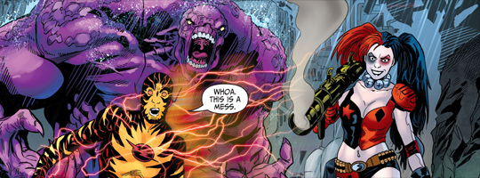 (1) Reverse Flash asks Harley why she still wears clown makeup if she hates the Joker. Harley says it's because she likes it. That'd be some fine insight, had it not been recently retconned that her skin's permanently Jokerized. In which case, her answer should have been that it's not makeup.