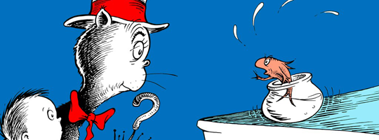 The sun did not shine. It was too wet to play. So we sat in the house All that cold, cold wet day. I sat there with Sally. We sat there, we too. And I said, “How I wish We had something to do!” Too wet to go out And too cold to play ball. So we sat in the house. We did nothing at all. So all we could do was to Sit! Sit! Sit! Sit! And we did not like it. Not one little bit. And then Something went BUMP! How that