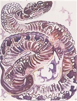 "I have just captured a reptile over five feet long. I call it a palmetto snake for purely aesthetic reasons. It is seen best twined in and out among the stems of the leaves. The pattern of the scales in brown and yellow and lilac repeats the palm motif in the stem."