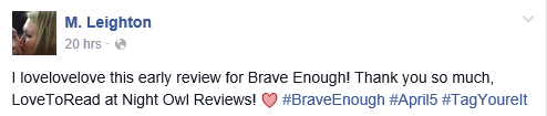 OMG! One of my favorite authors, M. Leighton, loved my review of her newest book Brave Enough which comes out in April. Per Night Owl Reviews rules, I can't post the review yet, but this is freaking awesome!!!