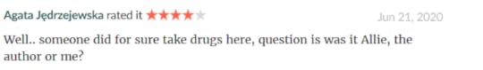 One of my ARC team's review of Potheads,my Alice retelling, used with her permission. I'm DYING laughing ya'll. No drugs were harmed in the writing of this book.