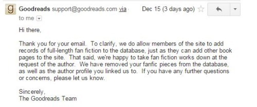 'Holy shit! What the fuck is wrong with you!! Stop adding fanfic to GoodReads without permission!! The author does not want her work, or her personal accounts linked to this! Why in the hell would you do this?'